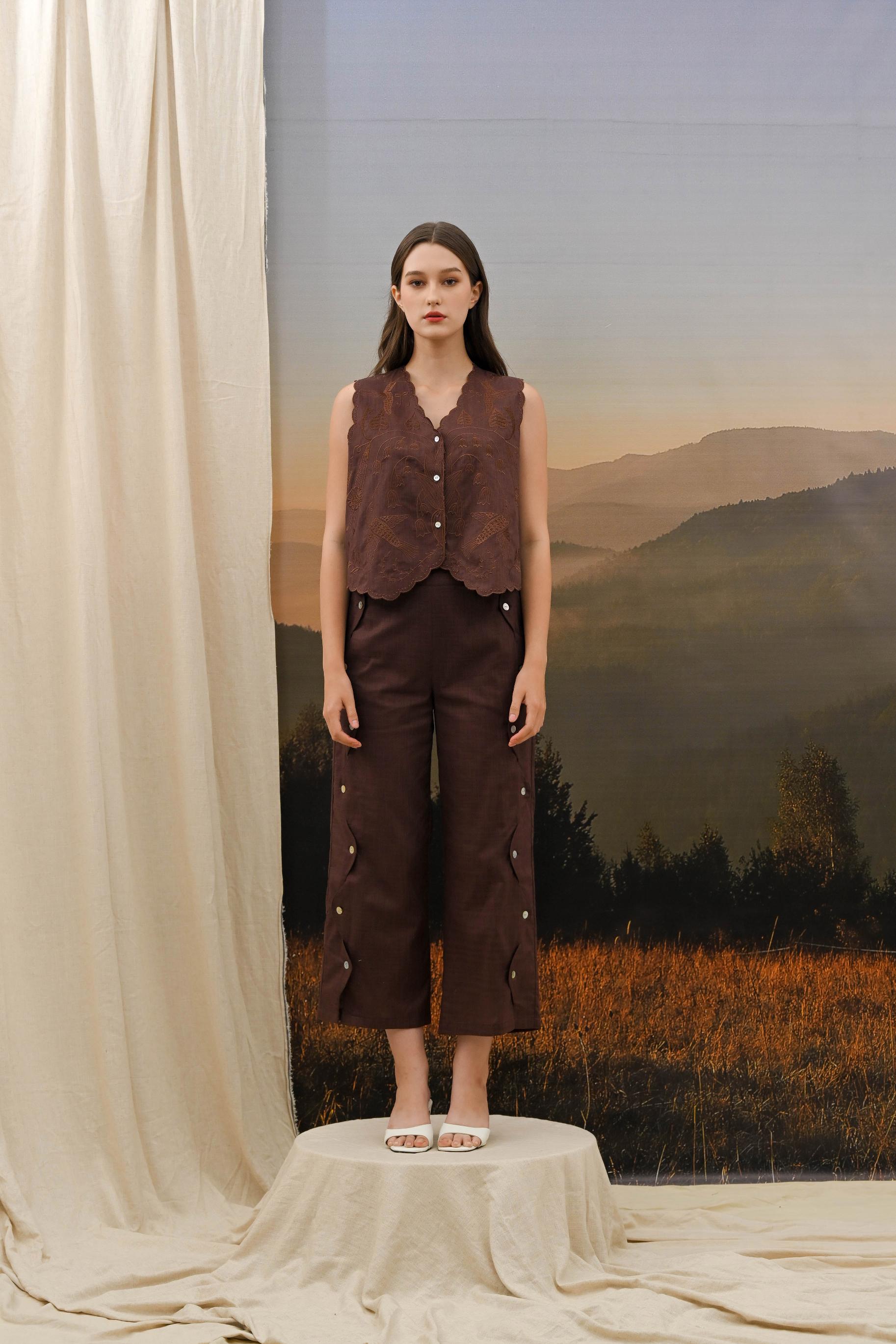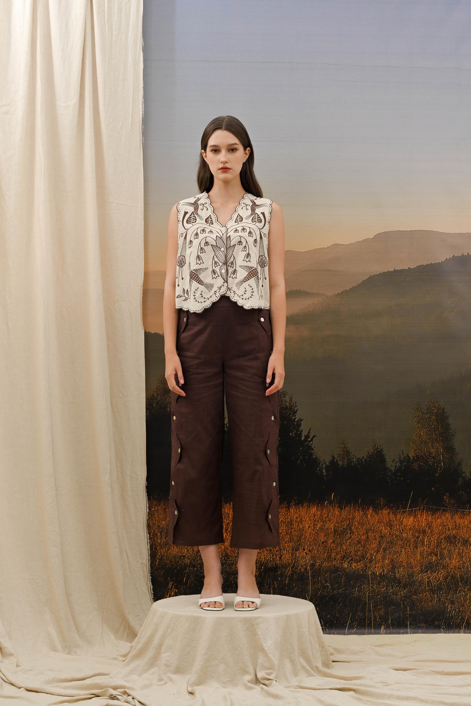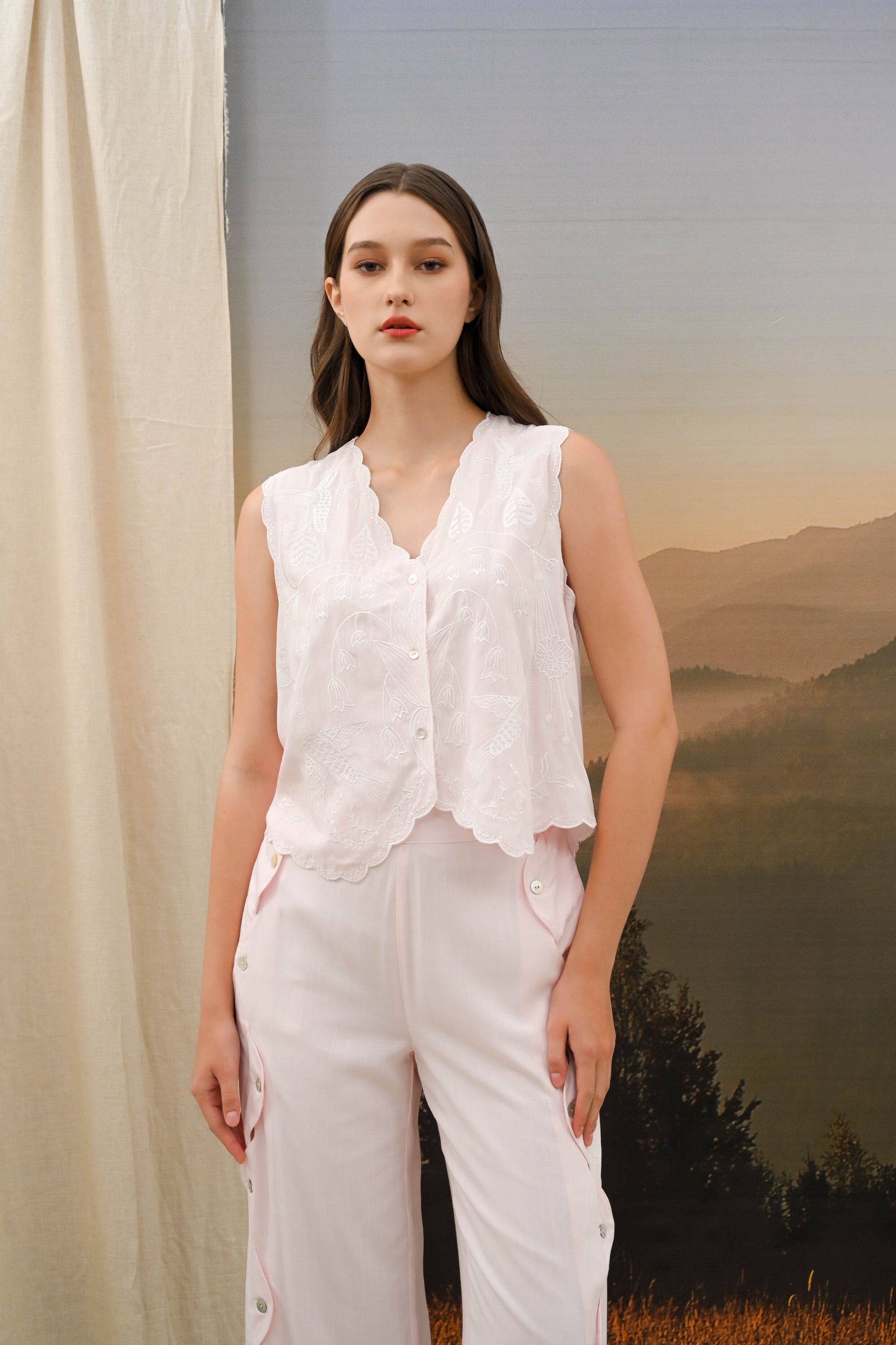 A beloved Sage bestseller, the Vest returns with its signature all-over hummingbird embroidery — a design exclusively crafted by Sage. The intricate patterns flow across soft scalloped hems, celebrating craftsmanship and detail. Finished with delicate shell buttons, this timeless piece layers beautifully over any look, adding an artful touch to your everyday wear.