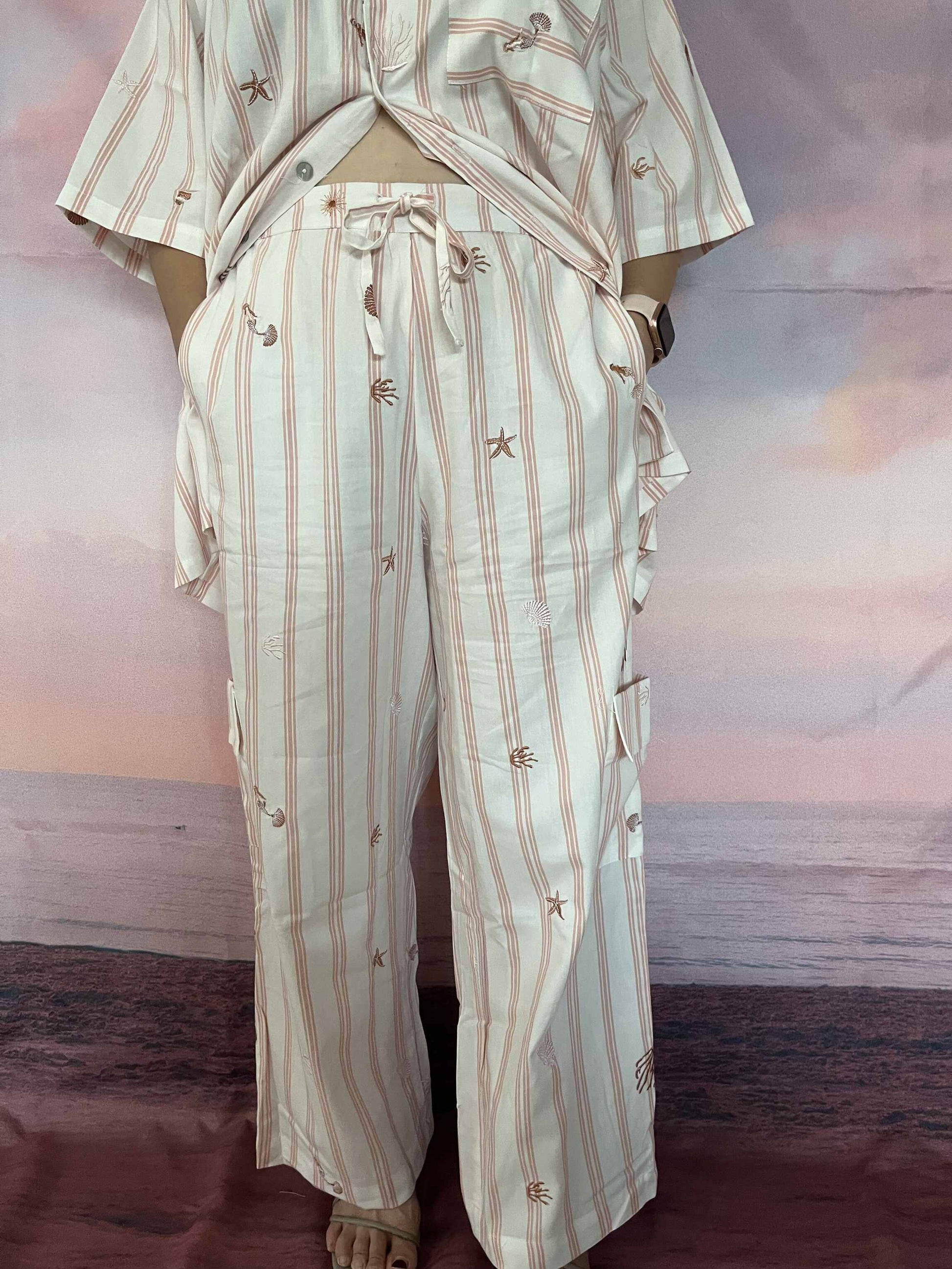 High rise cargo pants with an elastic waist made from relaxed material for easy movement. Comes with functional side pockets and front tie