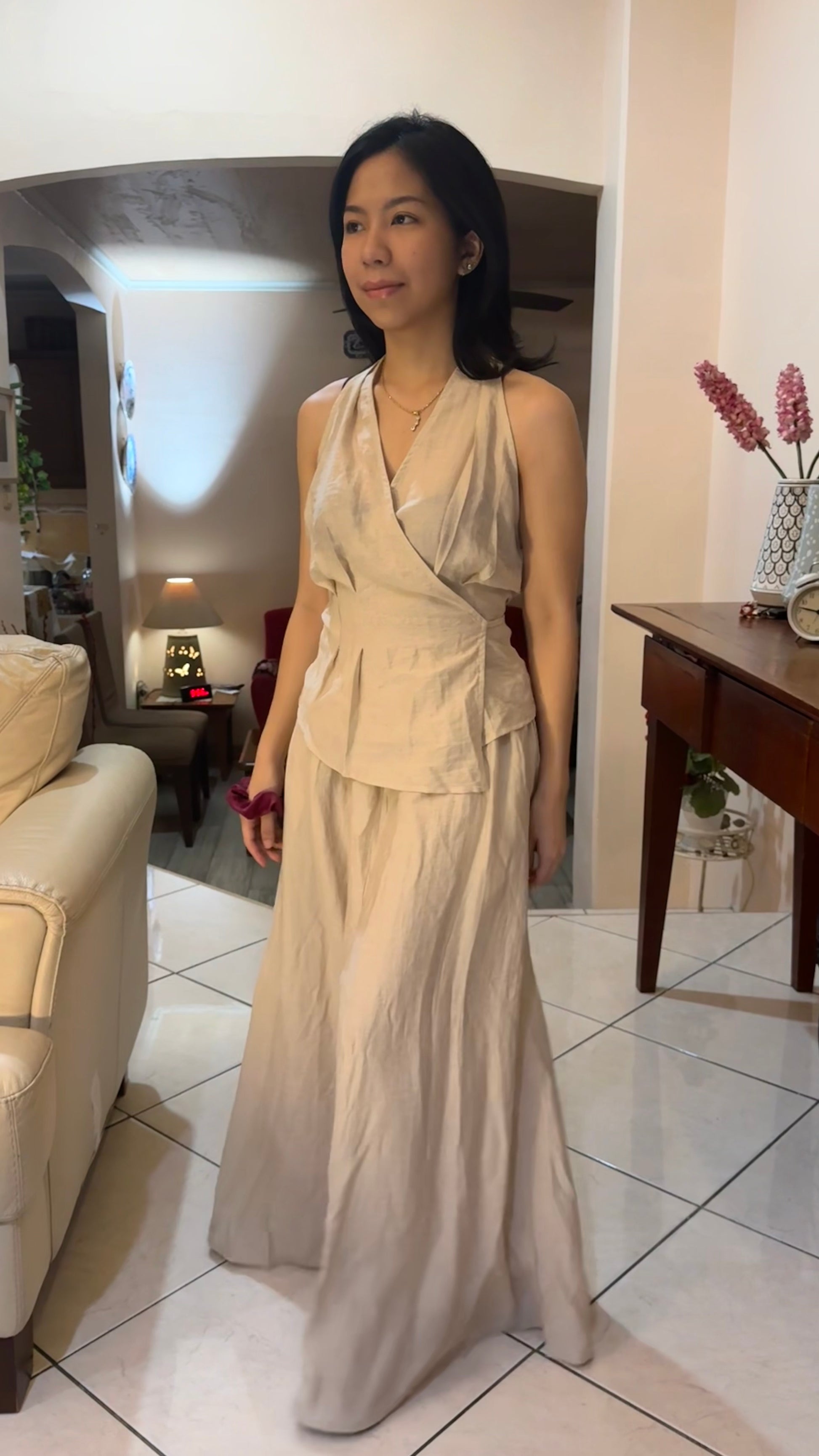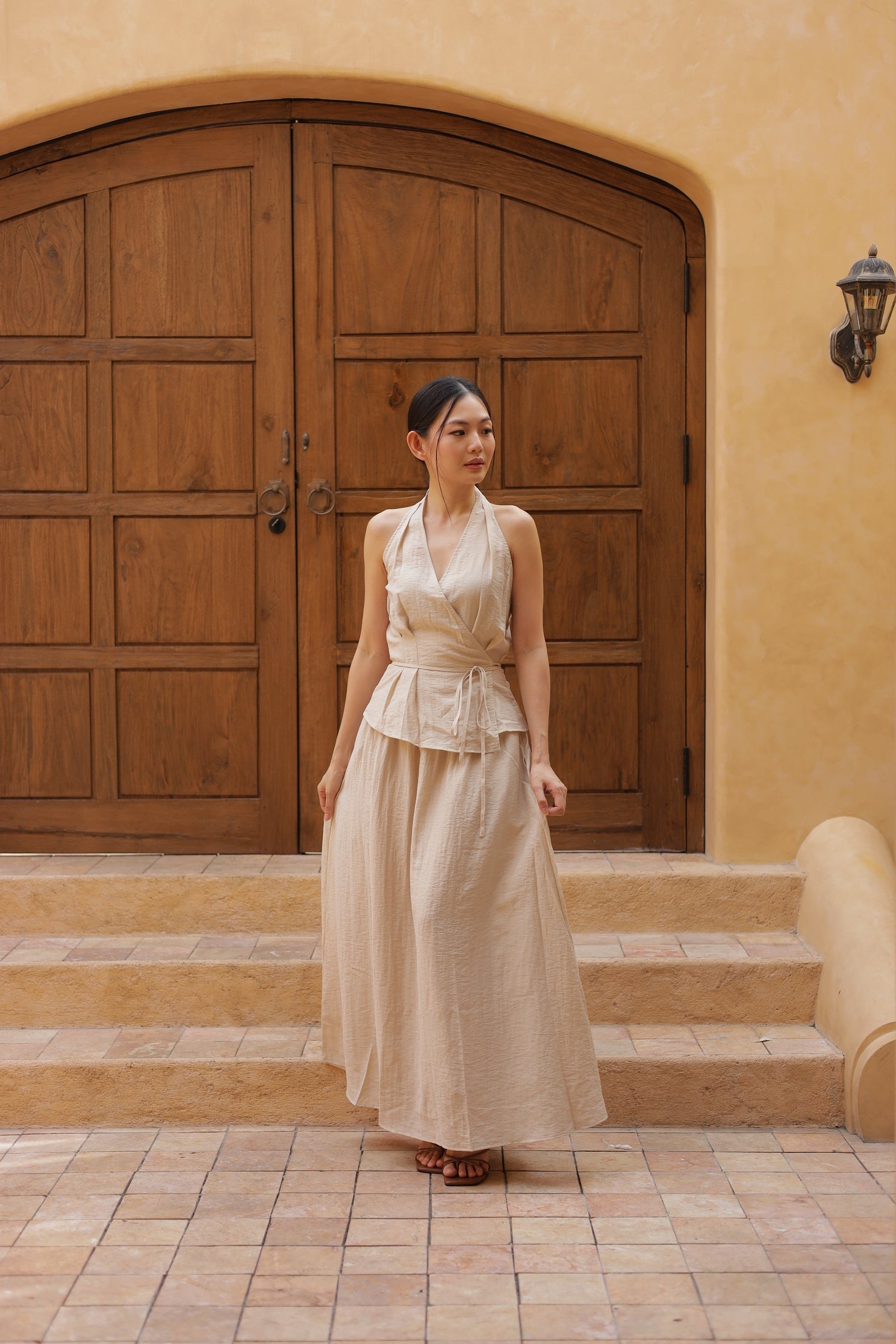 The Libbie Set combines timeless ease with understated elegance. Featuring a sleeveless wrap top that flatters the waist and an airy A-line skirt with a fully elastic waistband for comfort. Designed to be worn together or mixed effortlessly with other pieces, this set embodies the perfect balance of femininity and freedom.