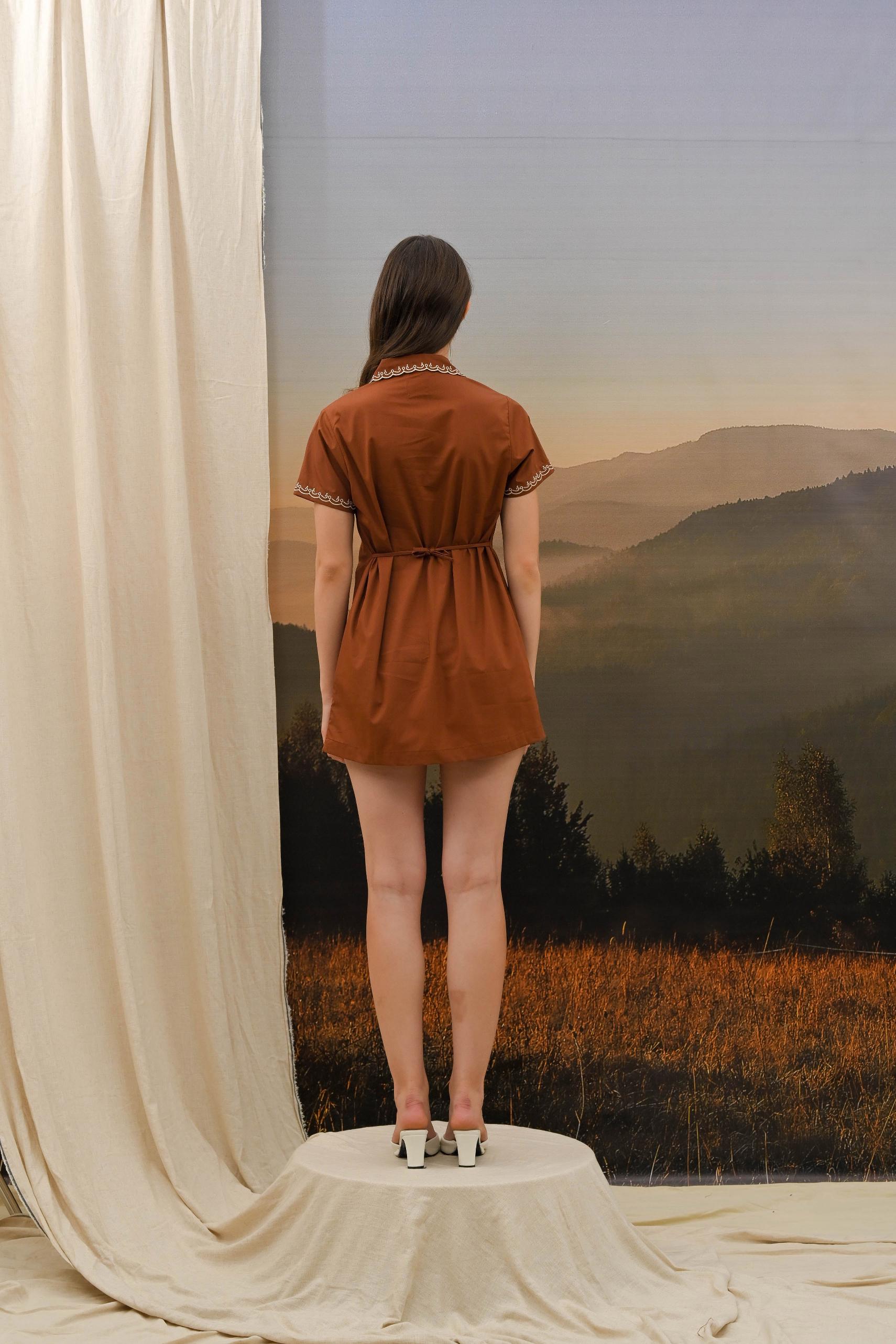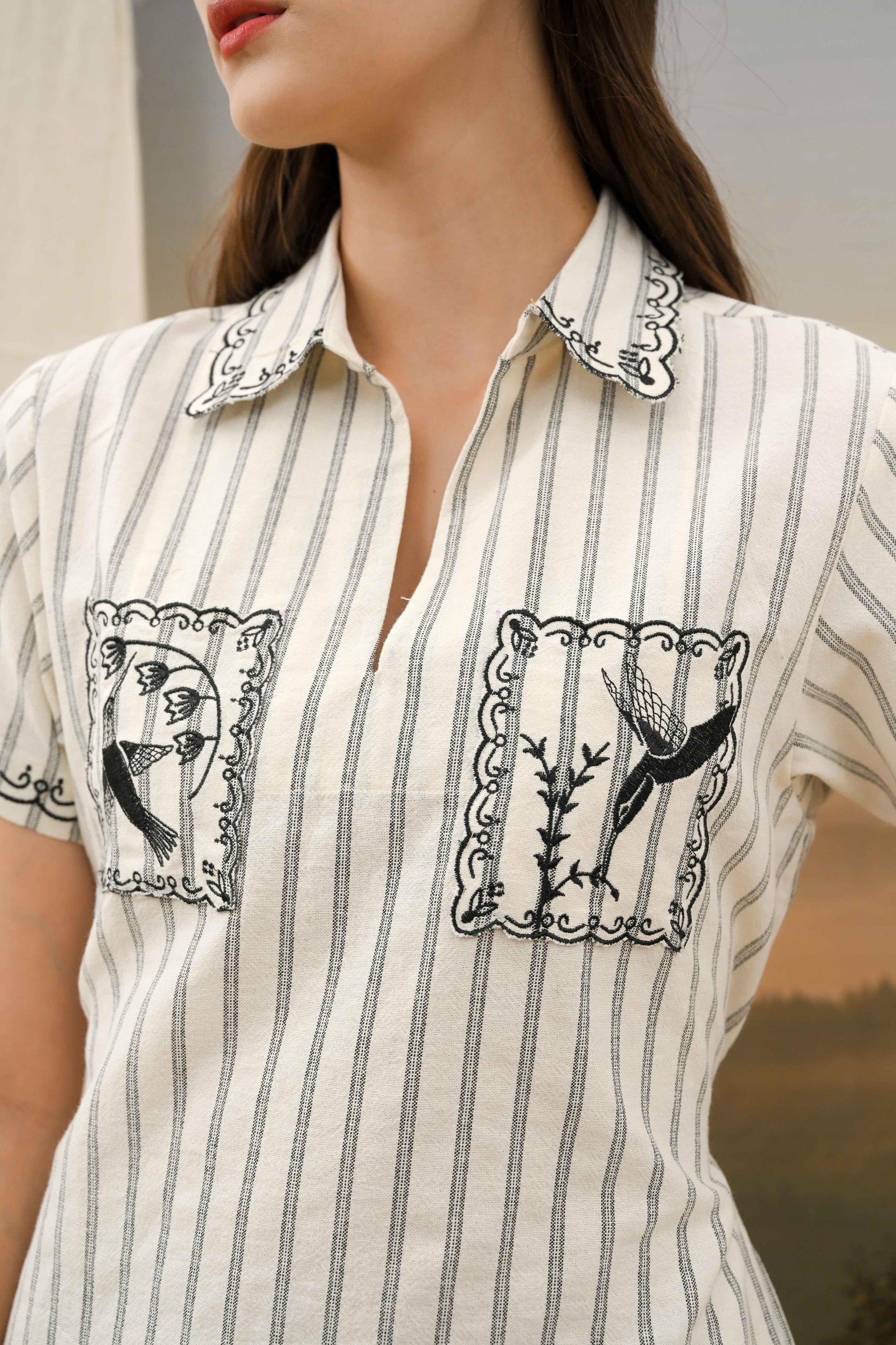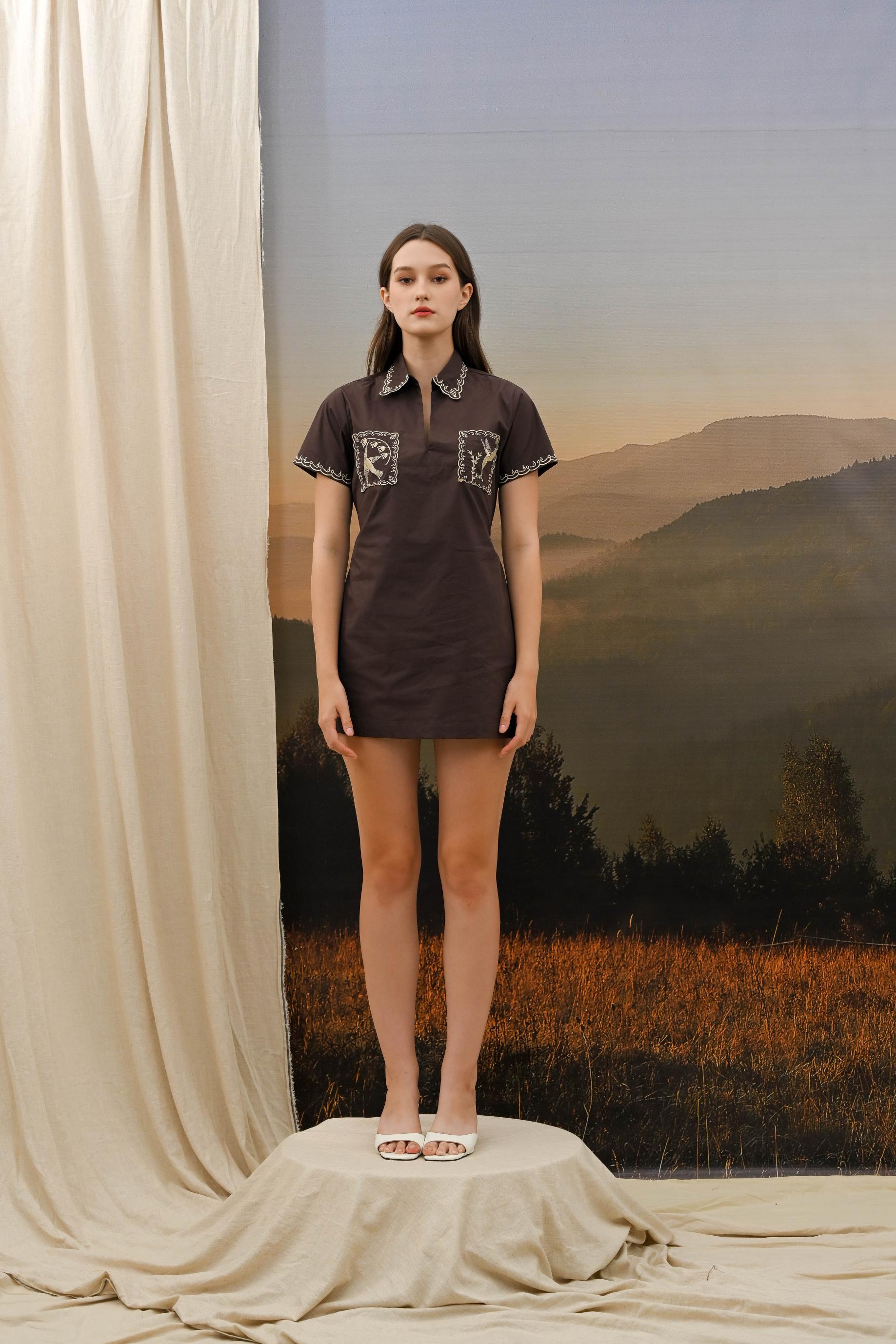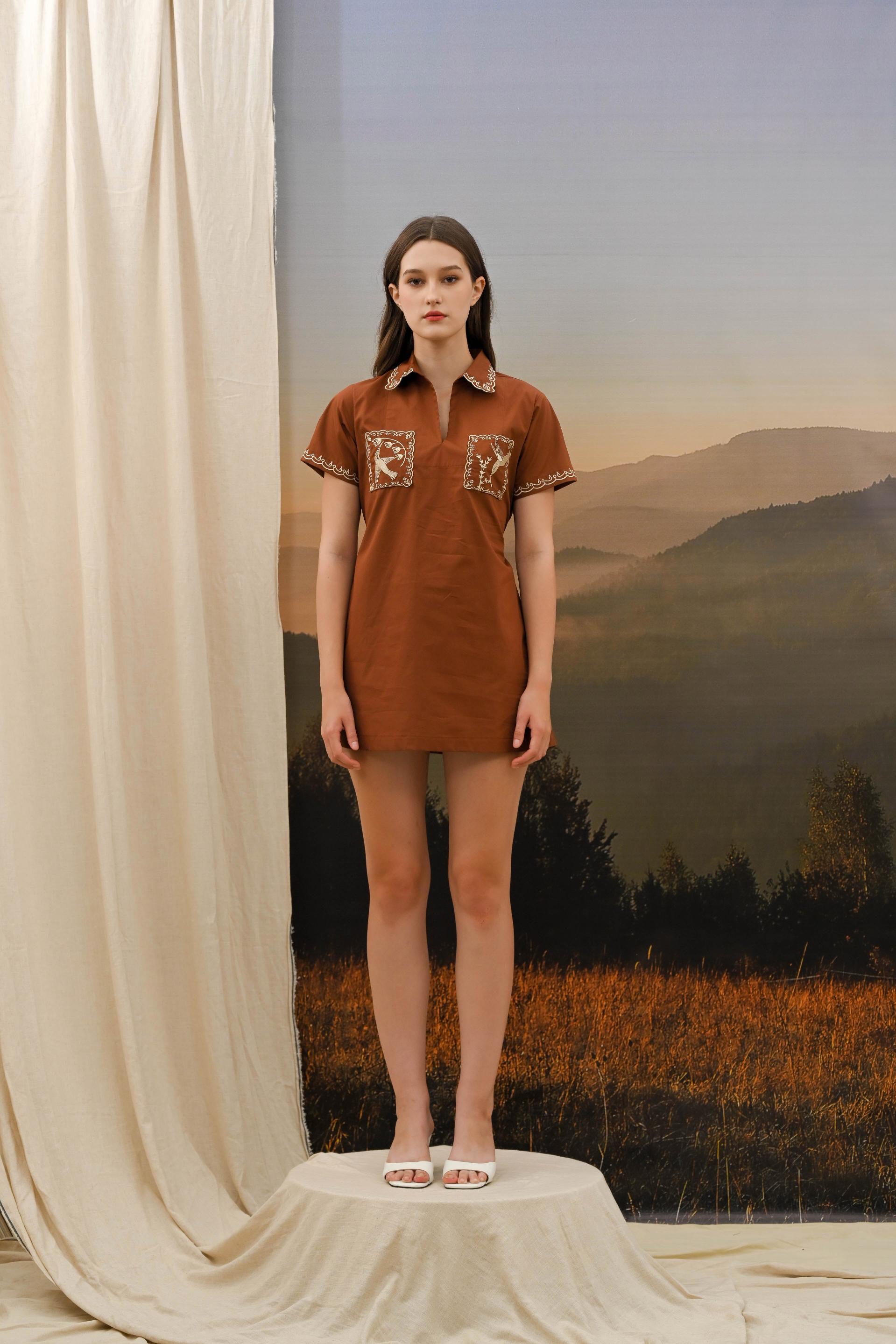 Relaxed mini dress with SAGE special hummingbird embroidery on front pockets, detailed embroidered collar, side pockets, and back tie for adjustable fit. Easy, timeless, and versatile.