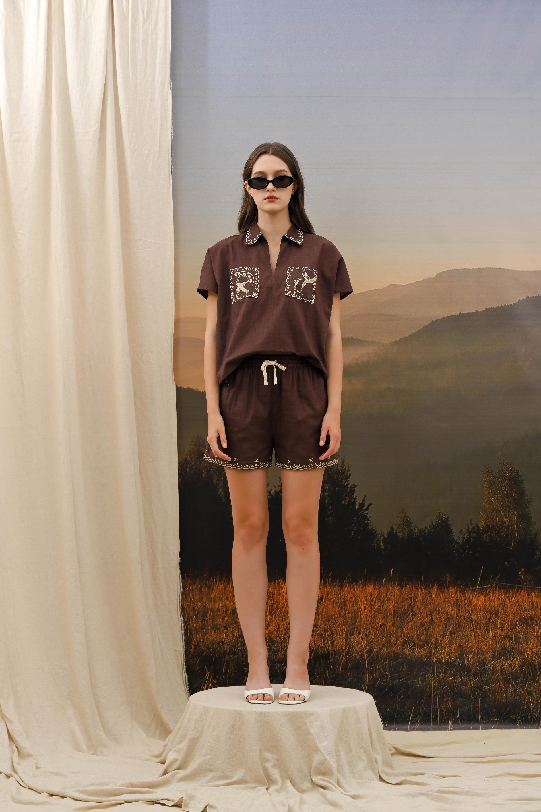 A breezy two-piece set designed for comfort and charm. The relaxed V-neck top features delicate hummingbird embroidery and detailed stitching on the collar, paired with matching shorts for a coordinated look. The shorts come with an elastic waistband and drawstring for an adjustable fit, complete with side pockets for ease. Embroidered accents at the hem add a soft, graceful touch to every step.