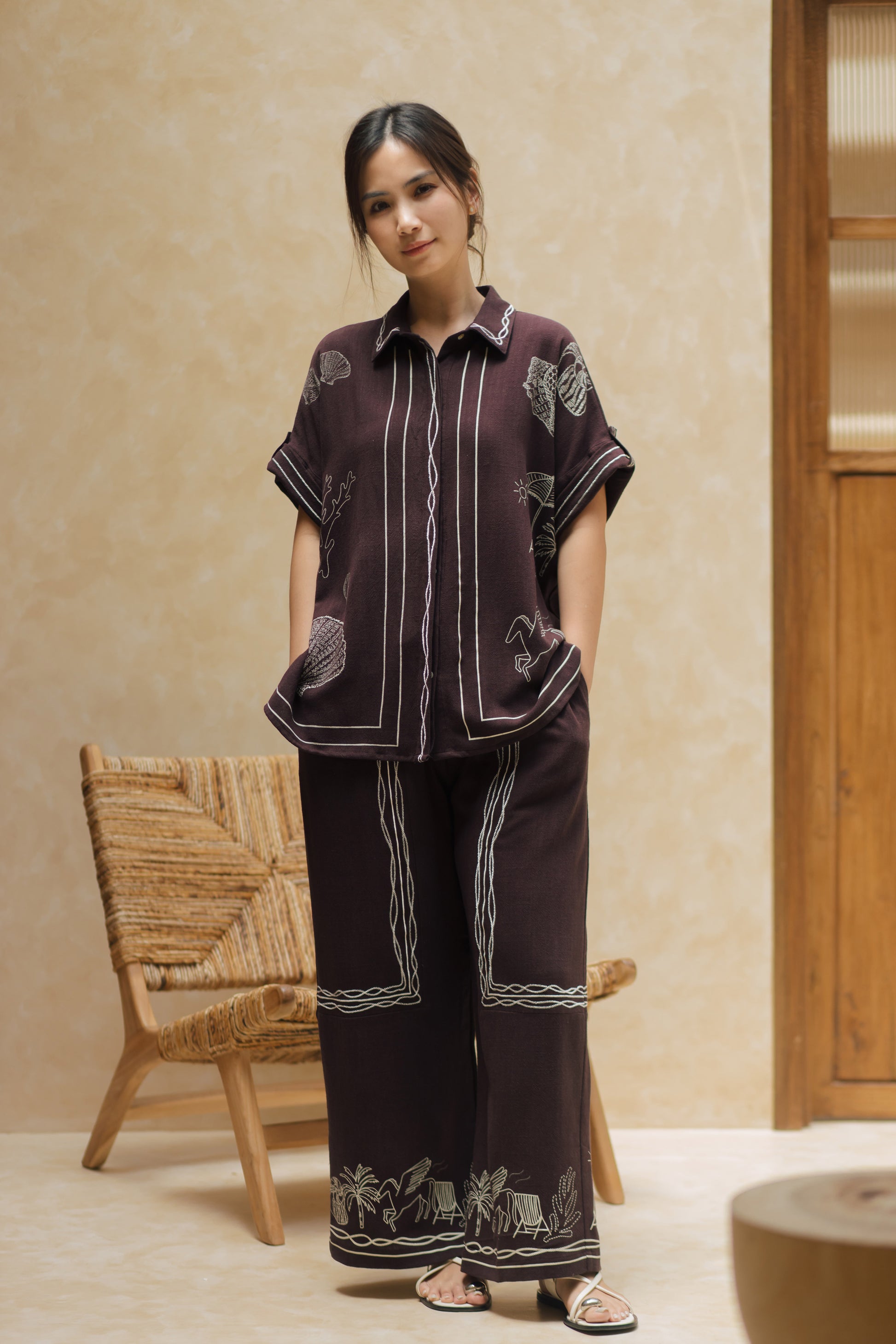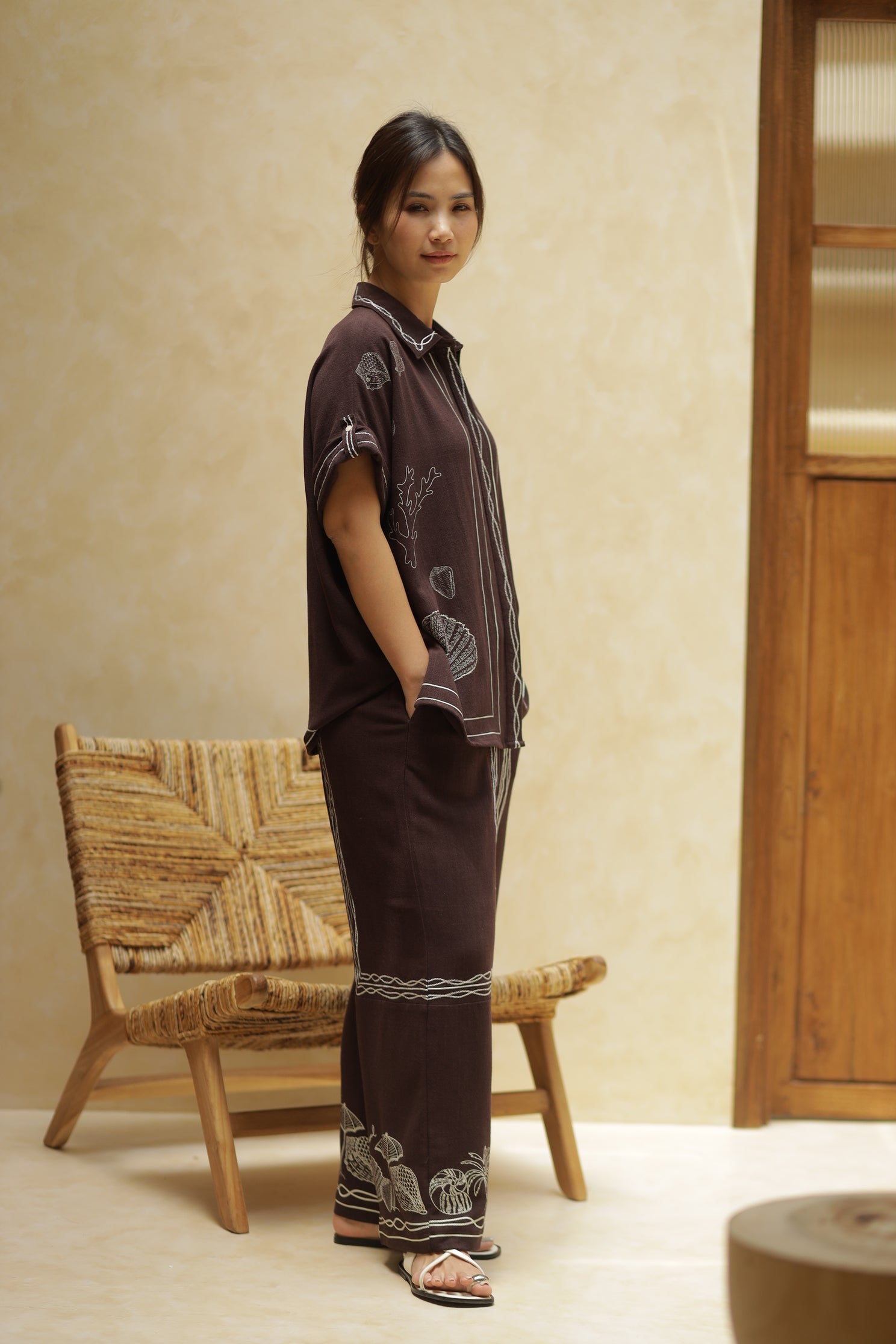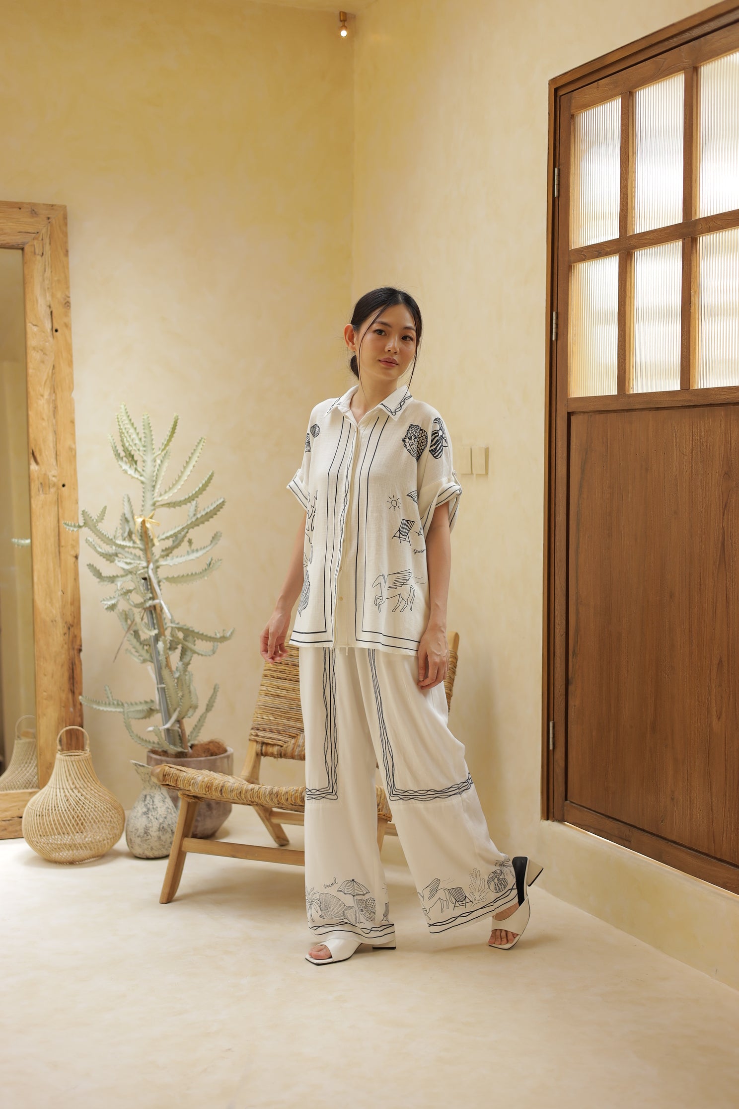The Reese Pants are flowy full-length pants designed for effortless movement and comfort. Featuring our signature SeaSoul digital print and embroidery detailing at the hem, they’re finished with pockets and a fully elastic waistband with drawstring for the perfect fit. A refined yet relaxed piece to elevate everyday styling.